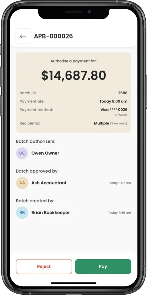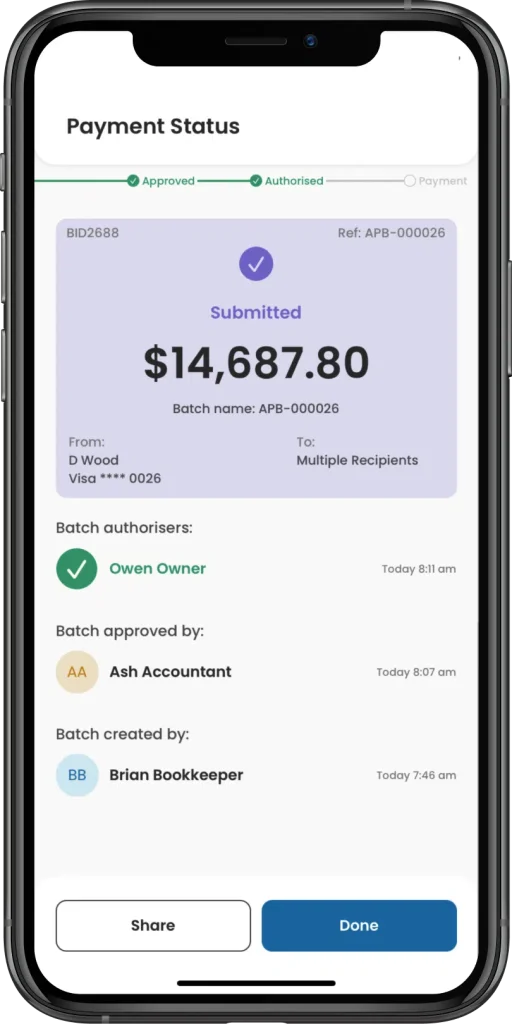 Fast-track approvals: Once your AP department sets up the payment batch, authorised users will receive personalised notifications on their mobile device, removing cumbersome approval emails and text chains.